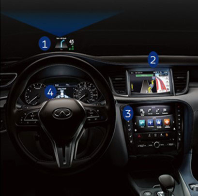 La visión en la conducción es parte fundamental en los modelos Infiniti. Para ello los ingenieros desarrollaron cuatro monitores que permiten tener mayor control de la información del vehículo en todo momento.  Estas pantallas se encuentran en secciones estratégicas en la parte frontal del tablero ergonómico del nuevo QX50 para brindar una visión de gran amplitud, control y seguridad ofreciendo una experiencia única de conducción.  Estos cuatro monitores son: