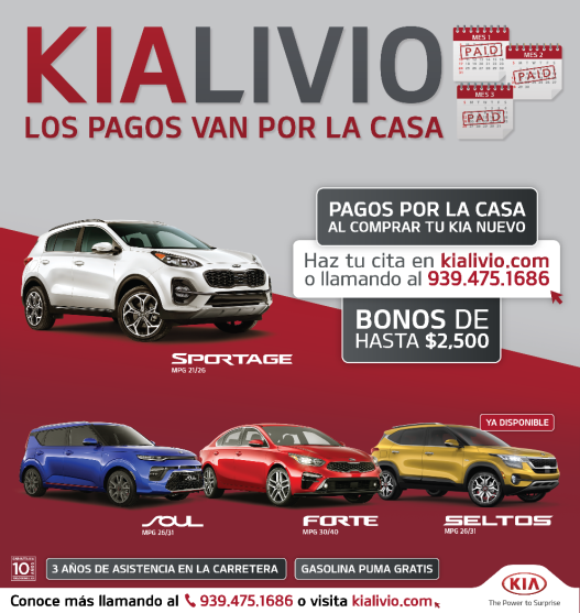 Para más información sobre las ofertas de Kia, visita www.kialivio.com o comunícate al 939-475-1686. Expertos de la marca estarán recibiendo a clientes en todos sus concesionarios de lunes a viernes en horario de 9:00am a 5:00pm.