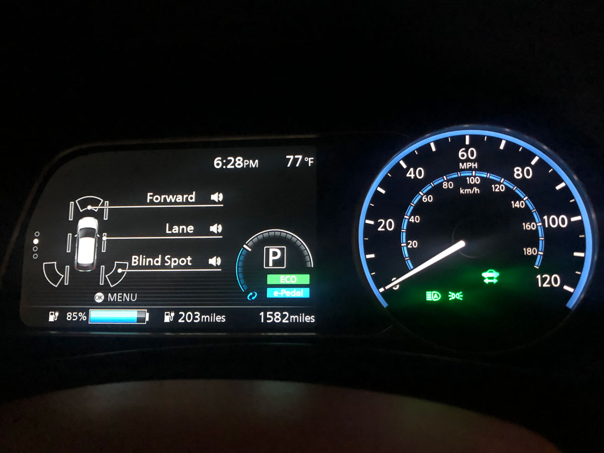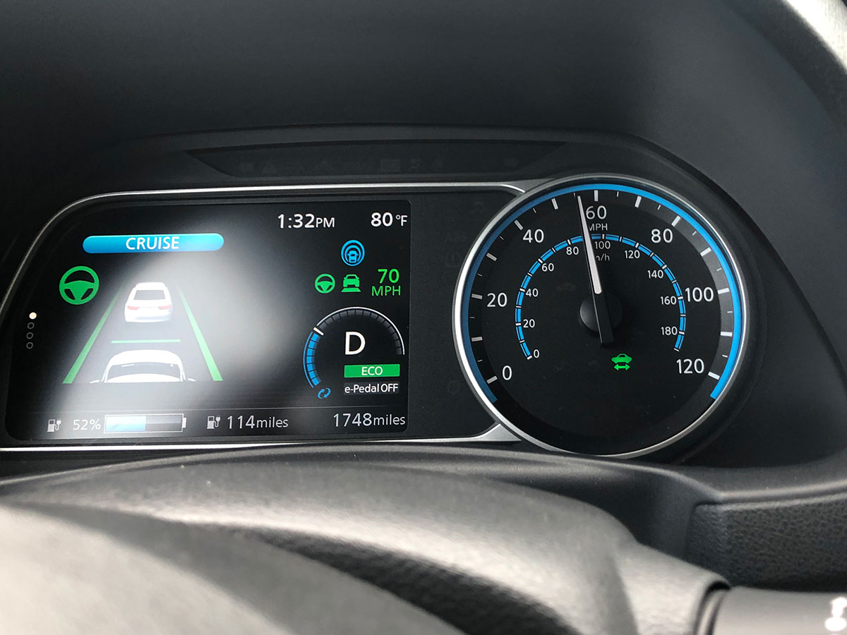 La manera de conducir tiene que ver mucho con el consumo de batería y como estábamos haciendo una prueba, decidimos acelerarlo en varias ocasiones subiendo cuestas. Al momento de llegar a la cima de la cordillera central en Cayey ya nos quedaba 51% de batería a una velocidad promedio de 60 mph*. En ese momento activamos el modo económico, el e-pedal y el ProPILOT Assist de Nissan para que el auto descendiera con el cruise control y a su vez ahorrara batería.