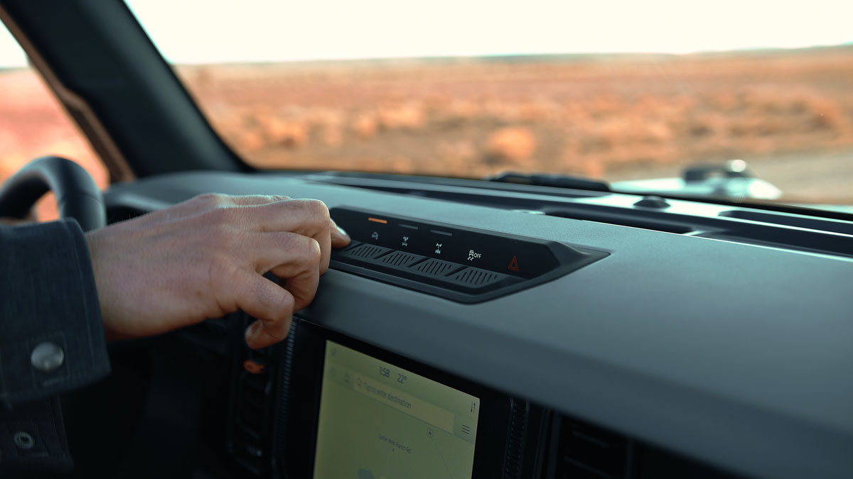 En el interior, todos los modelos Bronco están especialmente diseñados y listos para la acción. El panel de instrumentos está inspirado en el modelo de primera generación, con indicadores y controles claramente visibles e intuitivos. Los colores y materiales están inspirados en paletas naturales y equipos para exteriores. Con la funcionalidad todoterreno como enfoque primordial, los materiales son fuertes y resistentes.