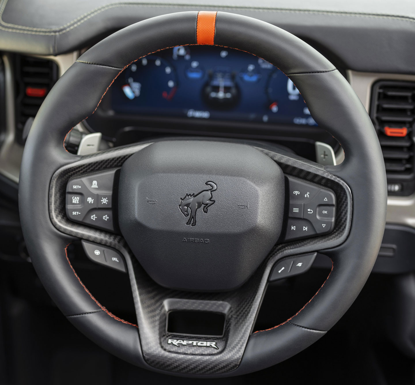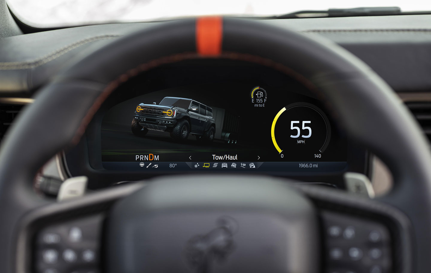 Bronco Raptor cuenta con un tablero horizontal que integra un nuevo panel de instrumentos de 12 pulgadas totalmente digital. El tablero permite a los conductores seleccionar varias vistas, incluida la Performance View, exclusiva de Bronco Raptor, que enfatiza las lecturas del tacómetro y de la transmisión, además de permitir la personalización de los indicadores.