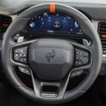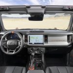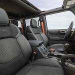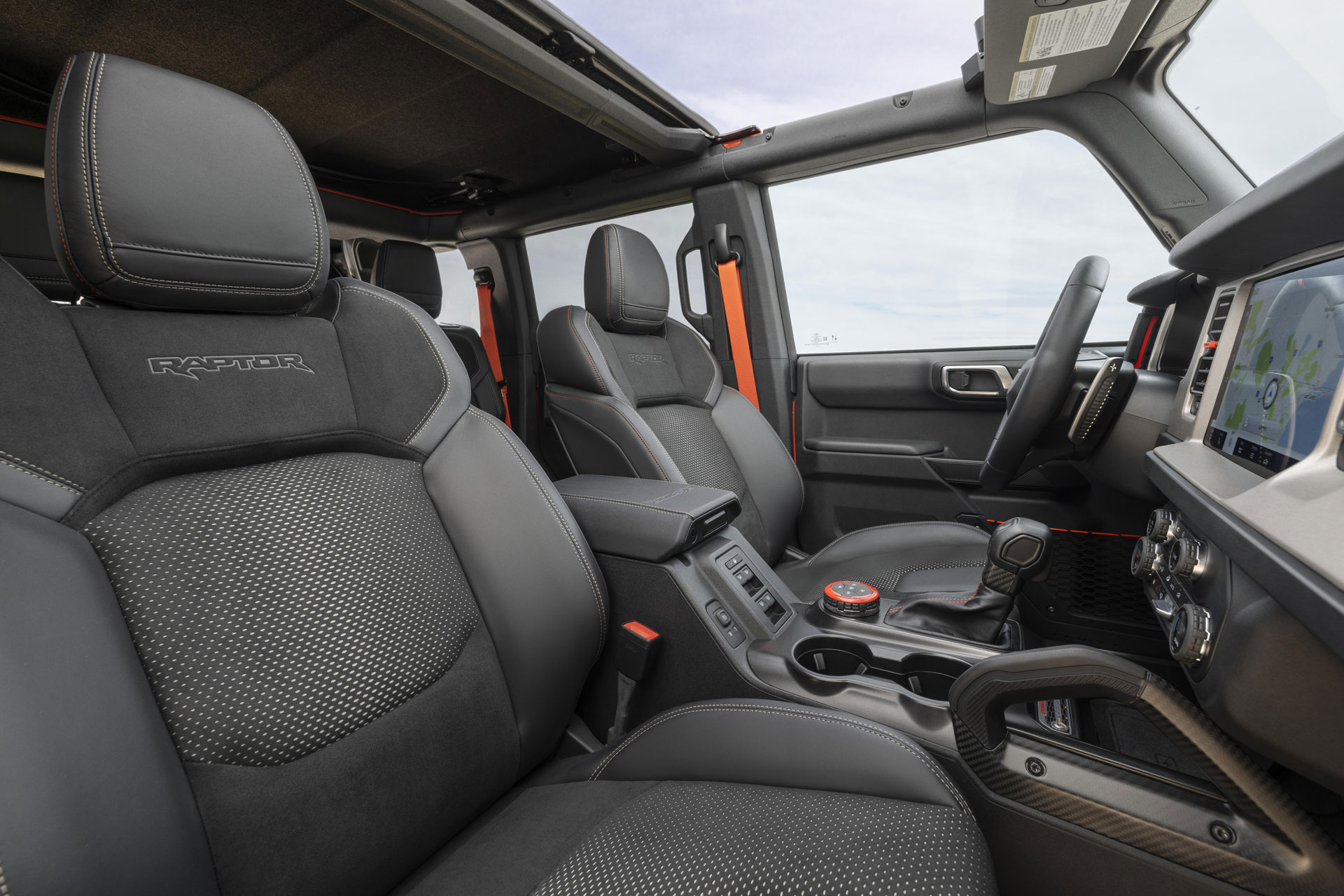 Los propietarios pueden optar por características mejoradas como los nuevos asientos de gamuza Black Onyx perforados con láser, la parte superior del panel de instrumentos forrada de vinilo, los refuerzos exteriores de los asientos forrados de cuero y el piso de alfombra. Un guía más grueso y de contorno deportivo con palancas de cambio de magnesio y el logo Raptor en negro brillante al centro continúa con el estilo Ford Performance. Los asientos delanteros diseñados por Ford Performance son exclusivos de Bronco Raptor, incluyendo agresivos refuerzos laterales de espuma para ayudar a mantener a los pasajeros firmemente sentados cuando el terreno se complica. Los cinturones de seguridad en color Code Orange opcionales proporcionan aún más estilo Ford Performance.
